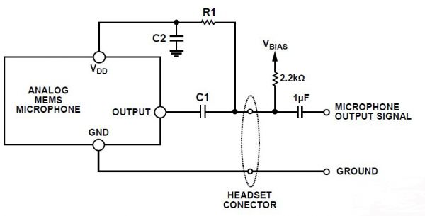 ECM的常見用例是在手機(jī)上連接的耳機(jī)中用作內(nèi)聯(lián)式語音麥克風(fēng)。這種情況下,耳機(jī)和手機(jī)之間的連接器有四個(gè)引腳:左側(cè)音頻輸出、右側(cè)音頻輸出、麥克風(fēng)信號以及接地。在這種設(shè)計(jì)中,ECM的輸出信號和直流偏置電壓在同一信號線路中傳輸。偏置電壓源通常約為2.2 V。