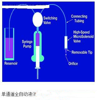 顯然在實際應(yīng)用中,上述微量注射器泵是無法獨立完成對液體的稀釋、分配工作的,因此還需要另一個關(guān)鍵部件——吸樣/加樣針(或探針)。將其通過管路連接至微量注射器泵上切變閥的某一功能端口,才能組成如下圖所示的“單通道全自動液體處理器”,再輔以合理的“關(guān)聯(lián)方法學(xué)協(xié)議”軟件就能打造出分析、診斷實驗室用的專業(yè)稀釋/分配器。在全自動液體處理技術(shù)中,前端加樣針是關(guān)鍵部分,因為加樣針的末端針形除必須要滿足實際應(yīng)用需求外,如穿刺功能、液面探測功能(LLD),還要考慮對加樣精度的影響以及是否會產(chǎn)生“掛珠”等現(xiàn)象。