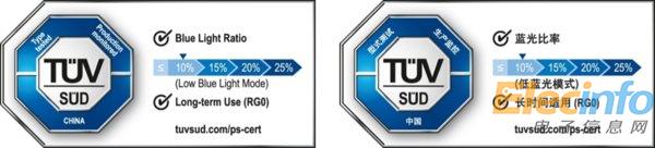 通過TUV南德嚴格的測試和認證程序后的電子顯示屏類產(chǎn)品可獲得TUV南德藍光比率等級認證標志,并接受獲證后生產(chǎn)監(jiān)控。此外,獲得該標志的產(chǎn)品在普通模式、自定義低藍光模式下具備低藍光和長時間適用特性,可滿足用戶的用眼健康需求。