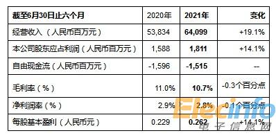 二零二一年上半年,集團(tuán)經(jīng)營收入實(shí)現(xiàn)人民幣64,099百萬元,同比增長19.1%。經(jīng)營成本為人民幣57,266百萬元,同比增長19.5%。經(jīng)營毛利為人民幣6,833百萬元,同比增長15.8%。毛利率為10.7%,同比下降0.3個百分點(diǎn)。集團(tuán)結(jié)合疫情防控和業(yè)務(wù)發(fā)展需要,利用數(shù)字化手段對外開展?fàn)I銷、對內(nèi)提升企業(yè)運(yùn)營效率,銷售、一般及管理費(fèi)用為人民幣5,497百萬元,占經(jīng)營收入比重為8.6%,同比下降0.3個百分點(diǎn)。本公司股東應(yīng)占利潤為人民幣1,811百萬元,同比增長14.1%,凈利潤率為2.8%,同比下降0.1個百分點(diǎn)。每股基本盈利為人民幣0.262元,同比增長14.1%。自由現(xiàn)金流[1]為人民幣-1,515百萬元,同比有所改善。