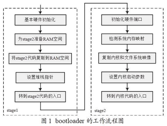 第二步常用C語(yǔ)言來(lái)實(shí)現(xiàn)。即:初始化本階段要使用到的硬件設(shè)備;檢測(cè)系統(tǒng)內(nèi)存映射(memory map);將kernel映像和根文件系統(tǒng)映像從flash上讀到ram空間中;為內(nèi)核設(shè)置啟動(dòng)參數(shù);調(diào)用內(nèi)核。圖1所示是bootloader的工作流程圖。