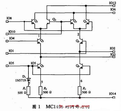 MC1496的內(nèi)部結(jié)構(gòu)如圖1所示,圖2為利用乘法器實(shí)現(xiàn)的普通調(diào)幅的仿真電路(調(diào)制信號(hào)為200 mV/20 kHz,載波信號(hào)為100 mV/1 MHz)及波形圖,仿真波形圖中橫軸為時(shí)間(20 μs/div),縱軸為幅度(20 mV/div)。圖3為利用乘法器實(shí)現(xiàn)的雙邊帶調(diào)幅的仿真電路(調(diào)制信號(hào)為200 mV/20 kHz,載波信號(hào)為100 mV/1 MHz)及波形圖,仿真波形圖中橫軸為時(shí)間(20μs/div),縱軸為幅度(500μv/div)。