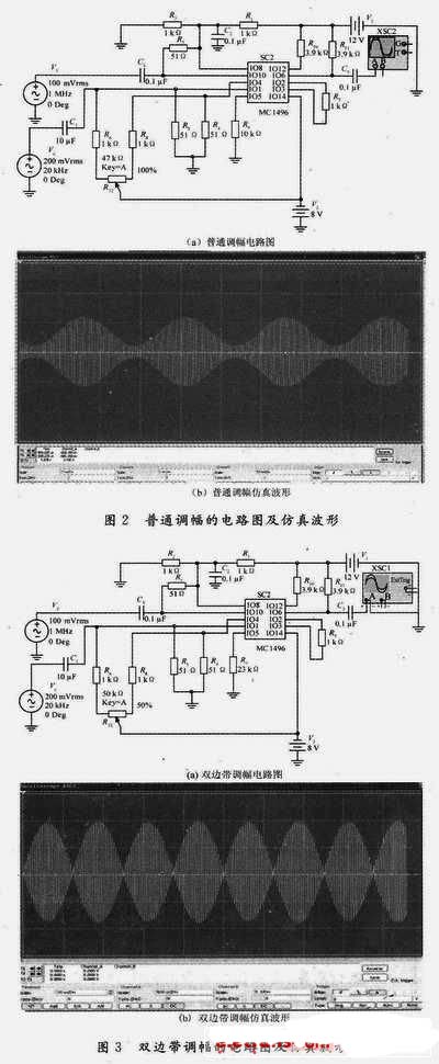 在授課過(guò)程中,對(duì)于電路進(jìn)行理論分析的同時(shí),可通過(guò)Multisim,EWB,PSPICE,SystemView等仿真軟件輔以生動(dòng)的仿真演示,實(shí)現(xiàn)理論講解和驗(yàn)證的同步進(jìn)行,不僅能增強(qiáng)教學(xué)的直觀性與靈活性,而且能夠最大限度地利用有限的授課學(xué)時(shí),加深學(xué)生對(duì)基本理論知識(shí)的理解,為傳統(tǒng)的教學(xué)方法注入活力。例如,可采用非線性器件所構(gòu)造的模擬乘法器MC1496來(lái)實(shí)現(xiàn)信號(hào)調(diào)幅、檢波、混頻、鑒相等電路,其原理在很多文獻(xiàn)書(shū)籍當(dāng)中均有描述,通過(guò)仿真演示可使學(xué)生更加直觀的了解。