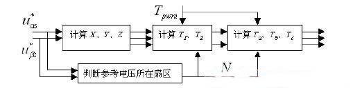 SVPWM 信號(hào)的實(shí)時(shí)調(diào)制需要定子參考電壓矢量的二維靜止坐標(biāo)系α軸和β軸的分量uα。 s 、uβ。 s 以及PWM 周期Tpwm 作為輸入,其產(chǎn)生框圖如圖2 所示。