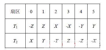 參考電壓矢量位于被基本空間矢量所包含的扇區(qū)中時(shí),矢量作用時(shí)間的相對(duì)值T1 和T2 可以用X,Y 或Z 表示,它們的對(duì)應(yīng)關(guān)系如表1 所示。表1T1、T2 與X、Y、Z 的對(duì)應(yīng)關(guān)系表