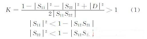 穩(wěn)定性是指放大器抑制環(huán)境的變化(如信號頻率、穩(wěn)定、源和負(fù)載等變化時),維持正常工作特性的能力,一個微波管的絕對穩(wěn)定條件是:
