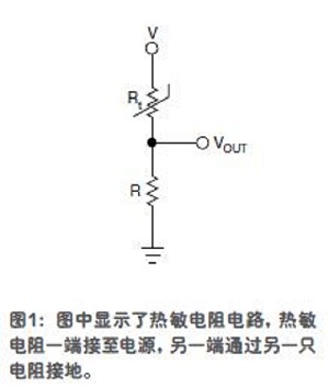 當(dāng)精度要求提高到±0.1℃時(shí),溫度范圍就要折衷到更小的范圍(小于100℃),此時(shí)可以用熱敏電阻。與RTD類似,熱敏電阻的電阻值也是隨溫度而變化。熱敏電阻通常會(huì)接成一個(gè)電阻分壓器結(jié)構(gòu),其中另一只電阻與熱敏電阻有相同的標(biāo)稱值(25℃室溫下的阻值)。熱敏電阻的一端接至電源,另一端接另一只電阻,然后接地(圖1)。探測(cè)溫度時(shí),測(cè)的是分壓器中點(diǎn)的電壓??梢灶A(yù)計(jì),在25℃時(shí)的電阻為+V/2。如有偏差,則可以計(jì)算出熱敏電阻的阻值,并用一個(gè)查找表確定出被測(cè)的環(huán)境溫度。