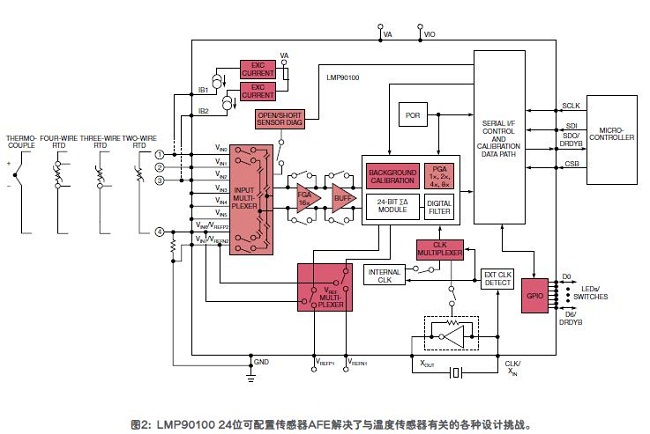 總之,溫度傳感器都需要偏置(可以是電壓或電流)。對(duì)于熱電偶來(lái)說(shuō),需要做冷結(jié)補(bǔ)償。德州儀器公司的LMP90100是一款24位傳感器模擬前端(AFE),它有四個(gè)差分或七個(gè)單端輸入、兩個(gè)匹配的可編程電流源,以及連續(xù)后臺(tái)校準(zhǔn)功能(圖2)。這款集成的可配置芯片可解決各種與溫度傳感器有關(guān)的設(shè)計(jì)挑戰(zhàn)。