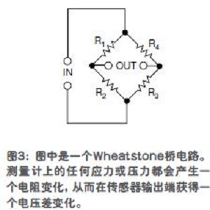 采用Wheatstone橋電路的應(yīng)變計(jì)與稱重傳感器常用于測(cè)量壓力、力與重量。元件被施加任何應(yīng)力或壓力后,都會(huì)產(chǎn)生一個(gè)電阻變化,從而在傳感器輸出端出現(xiàn)一個(gè)電壓差變化(圖3)。這些傳感器產(chǎn)生的電壓很低,通常在毫伏范圍。要獲得最精確的測(cè)量,必須將這個(gè)小電壓放大到數(shù)據(jù)轉(zhuǎn)換器的整個(gè)動(dòng)態(tài)范圍內(nèi)??删幊淘鲆娣糯笃?PGA)級(jí)可以與多個(gè)傳感器相連接,有最好的靈活性。這一級(jí)應(yīng)有低噪聲、低偏移、低漂移的特性,以確保最佳的系統(tǒng)性能。