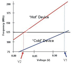 圖 1 顯示了特定處理器的典型性能分布情況。其中,“冷”器件要求 0.94V 電壓以實(shí)現(xiàn) 125 MHz 的運(yùn)行,而“熱”器件則只需要 0.83 V 就可實(shí)現(xiàn)相同頻率的運(yùn)行。自適應(yīng)電壓縮放 (AVS) 使用一個(gè)可相應(yīng)調(diào)節(jié)電源電壓的反饋環(huán)路,這樣單個(gè)器件便可以完成特定處理任務(wù)所需的頻率運(yùn)行了。