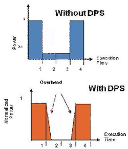 前兩種有源電源管理方法可獲得理想速度下運(yùn)行器件局部所需的最低工作電壓。相比之下,第三種方法動(dòng)態(tài)電源轉(zhuǎn)換 (DPS) 可確定器件何時(shí)完成其當(dāng)前計(jì)算任務(wù),如果當(dāng)前并不需要,則將器件切換到低功耗狀態(tài)(請(qǐng)參見(jiàn)圖 2)。例如,在等待 DMA 傳輸完成時(shí),處理器進(jìn)入低功耗狀態(tài)。喚醒時(shí),處理器可以在數(shù)微秒時(shí)間內(nèi)迅速返回到正常狀態(tài)。