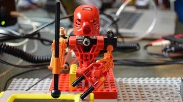 樂隊(duì)里的每位成員都是帶有橡皮筋和滑輪的樂高生化戰(zhàn)士形象,機(jī)器人的手臂通過一個(gè) Arduino Uno 控制器連接一臺(tái) iPad ,iPad 運(yùn)行 Nord Beat app (步進(jìn)音序器應(yīng)用軟件)。這位風(fēng)趣的音樂家同時(shí)為這些機(jī)器人配備了一系列合成樂器和鼓,通過這些設(shè)備,這支樂高機(jī)器人樂隊(duì)可以彈奏一些預(yù)設(shè)的歌曲,或是通過應(yīng)用程序人為設(shè)置的音樂,實(shí)現(xiàn)現(xiàn)場(chǎng)實(shí)時(shí)演奏。