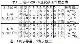 這種新型的三電平雙Buck逆變器依據(jù)是半周期工作模式:當(dāng)輸出電感電流iL為正半周時(shí),Buck1電路工作,當(dāng)電感電流為負(fù)半周時(shí),Buck2電路工作。其具體的工作模態(tài)如表1所示。經(jīng)過優(yōu)化的三電平雙Buck逆變器由于將其對(duì)地的寄生電容電壓牽制在輸入電壓的一半,所以其漏電流為零。