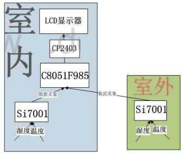 室內(nèi)、室外各放置2個(gè)Si7001溫濕度傳感器(以下簡(jiǎn)稱采集節(jié)點(diǎn)),定時(shí)喚醒采集溫度、濕度原始數(shù)據(jù),經(jīng)過(guò)Si7001內(nèi)部的AD轉(zhuǎn)換器,和出廠校準(zhǔn)的原始數(shù)據(jù)處理,轉(zhuǎn)換成溫、濕度最終數(shù)據(jù),經(jīng)由I2C總線傳遞到低功耗處理器C8051F985處理。C8051F985低功耗處理器決定啟用哪個(gè)采集節(jié)點(diǎn),以此降低功耗,并控制CP2403 LCD驅(qū)動(dòng),將數(shù)據(jù)最終顯示LCD顯示器上。
