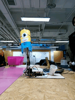 我們在小黃人的眼睛和雙手的位置分別裝了三個紅外傳感器(眼睛里的那個是不是毫無違和感呢,哈哈)。當(dāng)人手靠近傳感器時,傳感器的信號會發(fā)生變化。Arduino控制器接收到這種變化后,會控制對應(yīng)的舵機轉(zhuǎn)動到相應(yīng)的角度,保持一段時間后恢復(fù)原位。我們總共有兩個舵機,分別控制小黃人的向后倒和左右閃躲。同時,Arduino控制器通過LM386芯片驅(qū)動揚聲器,播放小黃人笑聲的wav音頻。
