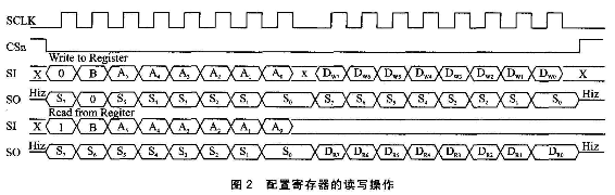配置寄存器的讀、寫操作時(shí)序如圖2所示。通過(guò)一個(gè)4線串行SPI兼容接口(SI、SO、SCLK和CSn)可對(duì)CC1120進(jìn)行配置,該接口還可用于讀取和寫入緩沖數(shù)據(jù)。SPI接口上的所有數(shù)據(jù)傳輸均以最高位開(kāi)始。