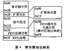 CC1120的寄存器空間主要作為CC1120的頻率、數(shù)據(jù)速率、中頻等大部分參數(shù)的配置。而擴(kuò)展寄存器大部分為芯片配置輔助測(cè)試寄存器(只讀),少部分為配置寄存器(可讀寫)。指令選通用于芯片狀態(tài)切換和沖刷RX/TXFIFO。128字節(jié)TX FIFO和128字節(jié)RX FIFO均通過(guò)0x3F地址進(jìn)行存取。當(dāng)R/W位為0時(shí),則TX FIFO被存取;當(dāng)R/W位為1時(shí),則RX FIFO被存取。其中,TXFIFO為只寫,而RX FIFO為只讀。寄存器地址映射如圖4所示。