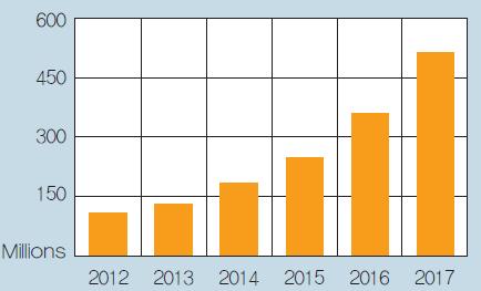 圖1:全球移動(dòng)感應(yīng)健康和健身傳感器出貨量 (2012年~2017年)。