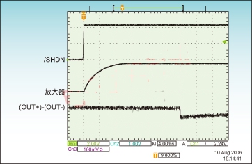設(shè)置開啟時(shí)間時(shí),IC設(shè)計(jì)工程師必須考慮放大器的輸入阻抗以及輸入偏置電壓和輸入偏置電容,輸入電容由應(yīng)用工程師選擇,以提供快速響應(yīng)的時(shí)間常數(shù)并保證低頻響應(yīng)盡可能平坦為目標(biāo)。圖3的測試波形表明/SHDN引腳拉高后,輸入偏置電壓爬升到正常值,延遲tON并激活輸出端。如果在此過程中,被激活的輸出平穩(wěn)開啟,揚(yáng)聲器不會發(fā)出咔嗒聲。