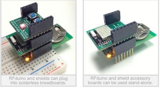 RFduino是由Open Source RF開發(fā)的一款僅有指尖大小的開發(fā)平臺,配備 Nordic 32 bit ARM Cortex-M0處理器,并支持Bluetooth 4.0。而且,開發(fā)商還為其開發(fā)了一系列擴展板,RFduino系列都有兩排排針和插槽,插入后即可聯(lián)通。在2013年4月,這款產(chǎn)品在Kickstarter上以7054%的成績完成了眾籌。
