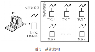 小封裝、低功耗、無線通信、安全性和互操作是醫(yī)療可穿戴式監(jiān)護設備設計的基本要求。本文所設計的生命特征監(jiān)護設備的系統(tǒng)結(jié)構(gòu)如圖1所示。系統(tǒng)主要由監(jiān)護PC主機、艙外主節(jié)點(coor—dinatornode)和艙內(nèi)的多參數(shù)采集傳感器子節(jié)點(sensornodes)等三個部分組成,主節(jié)點和各子節(jié)點之間通過IEEE802.15.4無線通信協(xié)議構(gòu)成一套結(jié)構(gòu)簡單、工作穩(wěn)定,運行可靠的星型無線通信網(wǎng)絡。