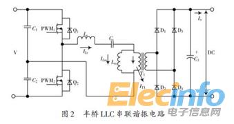 本文采用了一個半橋LLC串聯(lián)諧振電路,如圖2所示。半橋LLC串聯(lián)諧振電路包含輸入電容C1、C2,MOSFET Q1、Q2,諧振電感Lr,諧振電容Cr,變壓器T1,輸出整流二極管D1 ~ D4和輸出電容C3。
