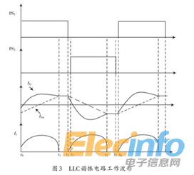 LLC電路根據(jù)開關頻率范圍可以分為四種模式,本文只討論fr》fs》fm模式下的工作原理,一個開關周期內整個工作過程如下所述,工作波形如圖3所示,PS1,PS2分別為Q1,Q2的驅動脈沖波形: