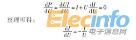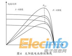 目前常用的最大功率跟蹤算法主要有恒定電壓跟蹤法、擾動觀察法、電導增量法等幾種,其中電導增量法以優(yōu)良的跟蹤性能倍受青睞。下面簡單介紹其工作原理。圖4是太陽能電池特性曲線圖。由圖可以看出,在最大功率點的時候功率曲線斜率為0,即功率P對電壓V的導數(shù)為0,所以有dPdU =0,又因為P=UI,所以: