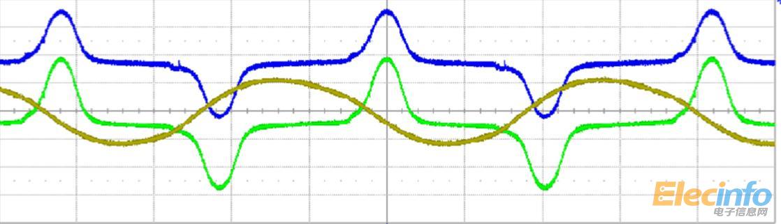 從左向右數(shù)的第一組箭頭所指之處是進入飽和點,大家可以看到黃色的電流向反方向逐漸增大,進入保護點后,藍色的和綠色的次級線圈的電壓波形幾乎是0了,說明變壓器已經沒有耦合了,已經進入了飽和區(qū)了,次級沒有電壓,意味著三極管沒有驅動信號,試問大家,這時兩個三極管處于什么狀態(tài)?