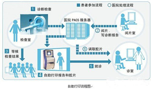 富士通K-1000醫(yī)用多功能自助打印工作站通過(guò)網(wǎng)絡(luò)與醫(yī)院的HIS、LIS、PACS等系統(tǒng)服務(wù)器連接,可以進(jìn)行化驗(yàn)單、診斷報(bào)告、膠片的自助打印。當(dāng)患者拍完CT/CR/DR等影像后,醫(yī)生編輯影像然后存入PACS系統(tǒng),接著就可以對(duì)此影像進(jìn)行診斷,并把報(bào)告發(fā)送到PACS系統(tǒng)存儲(chǔ)?;颊吣弥t(yī)院指定的就診卡(可以是條碼、磁卡、醫(yī)保卡、二代證等)在K-1000上刷一下就可以輕松領(lǐng)取自己的膠片及診斷報(bào)告。K-1000打印一份膠片及診斷報(bào)告僅1 分多種,而且可以24小時(shí)工作,這樣不僅降低了醫(yī)院的人力成本,排除了人為出錯(cuò)的因素,也給患者帶來(lái)了方便。