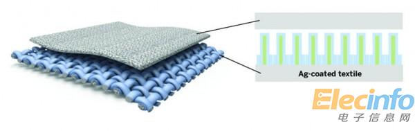 相關(guān)資料顯示動態(tài)充電裝置的材料是由雙層織物組成,由下上圖我們可以看到其中一層為鍍銀纖維,而另一層為涂上聚二甲基硅氧烷的氧化鋅納米棒,當(dāng)兩層材料在移動中產(chǎn)生摩擦之后就會在一端產(chǎn)生正電荷在另一端產(chǎn)生負電荷,從而形成回路。根據(jù)論文顯示的細節(jié)四平方厘米的鍍銀材料和涂上聚二甲基硅氧烷的氧化鋅納米棒能夠產(chǎn)生120V 65μA的輸出,而使用沒有涂層的氧化鋅納米能夠產(chǎn)生30V 20 μA的輸出,當(dāng)四層合在一起,能夠產(chǎn)生170V 120μA的輸出,能夠連續(xù)循環(huán)12000次。