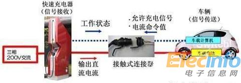 CHAdeMO采用的快速充電方式如圖所示,電流受控于汽車的CAN總線信號。即在監(jiān)視電池狀態(tài)的同時,實時計算充電所需電流值,通過通訊線向充電器發(fā)送通知;快速充電器及時接收來自汽車的電流命令,并按規(guī)定值提供電流。