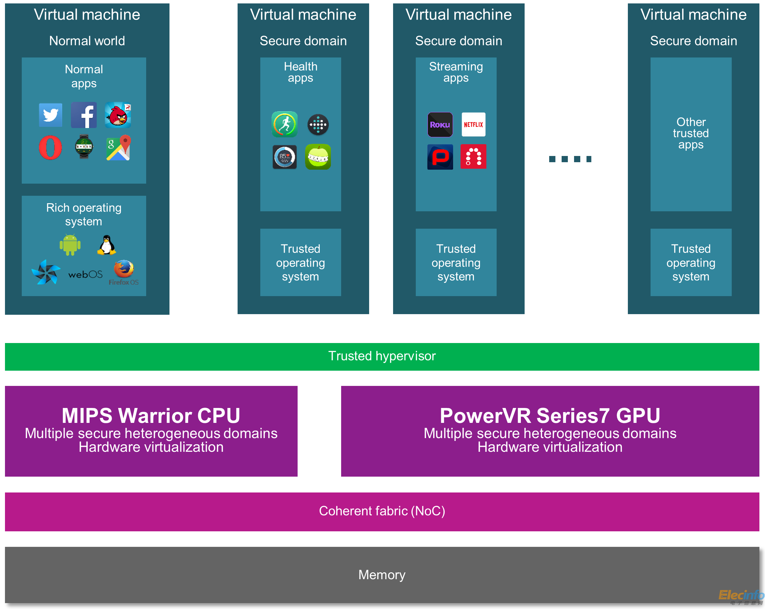 作為一項(xiàng)可伸縮的安全技術(shù),Imagination的OmniShield可確保需要安全的應(yīng)用有效并且可靠的彼此隔離,避免非安全應(yīng)用的干擾,同時(shí)還能滿足功能、性能、成本和功耗的需求。OmniShield超越了傳統(tǒng)的二元方法,能建立多個(gè)安全域(secure domain),讓每個(gè)安全、非安全的應(yīng)用程序及操作系統(tǒng)能在獨(dú)立的環(huán)境中運(yùn)作。例如,DRM和支付系統(tǒng)等安全進(jìn)程能與游戲和網(wǎng)頁瀏覽等非安全進(jìn)程共存。