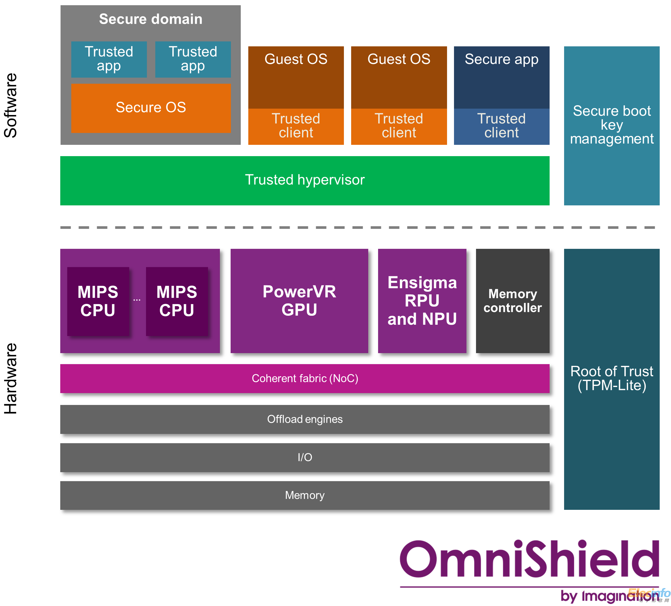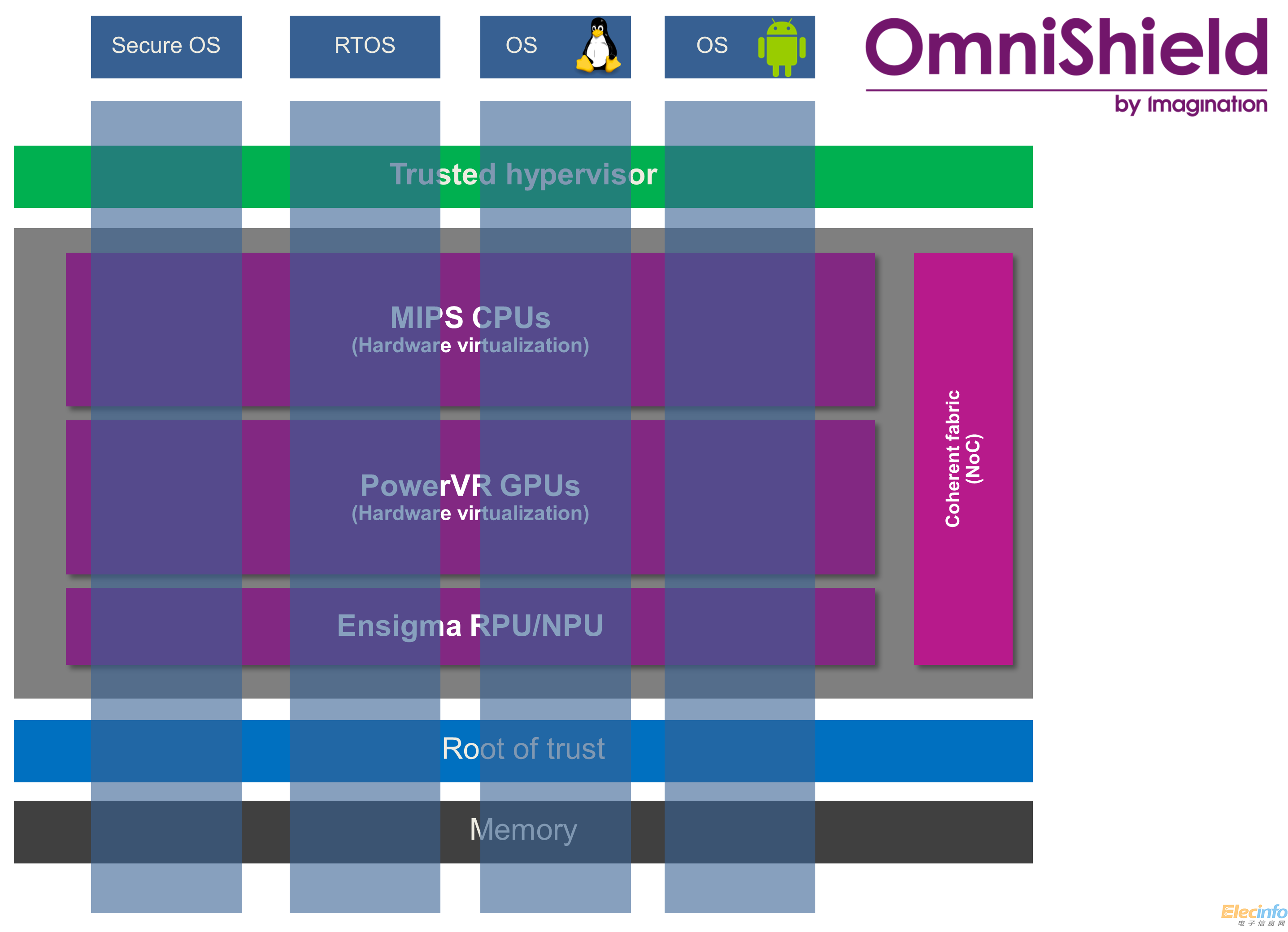 Imagination正將OmniShield支持納入其全系列處理器產(chǎn)品中,包括MIPS Warrior CPU、PowerVR多媒體處理器以及Ensigma處理器。Imagination的處理器專為在異構(gòu)、一致性集群中運(yùn)作所設(shè)計(jì)——這些集群通過可伸縮的安全互連結(jié)構(gòu)連結(jié)在一起,并利用由可信任的監(jiān)管程序控制的安全流將OmniShield遍及整個(gè)SoC。此外,Imagination與其合作伙伴將為OmniShield提供更多樣的虛擬化Root-of-Trust IP模塊,包括密碼(crypto)、公鑰加速器、真正的隨機(jī)數(shù)發(fā)生器、外部TPM的安全I(xiàn)/O以及安全ROM。