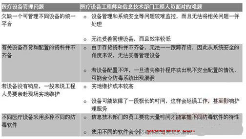 由于醫(yī)院不斷添購(gòu)新設(shè)備,輔助醫(yī)療和信息技術(shù)部門的工作人員每日面對(duì)的工作也不斷增加。有關(guān)的工作包括管理存貨、配置系統(tǒng)、載入修補(bǔ)程序、執(zhí)行防護(hù)功能、以及提供保修和維護(hù)服務(wù)。圖表1列出醫(yī)療設(shè)備工程師和信息技術(shù)工程師面對(duì)的問題以及這些問題對(duì)醫(yī)院日常運(yùn)營(yíng)所產(chǎn)生的影響。
