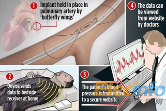 相比較傳統(tǒng)的心臟手術而言,該款芯片的植入過程其實和冠脈內支架術有些相似。首先,需要在其腹股溝處動脈上切開一個切口,再通過一個導管將“植入式遠程無線監(jiān)測系統(tǒng)”裝置送到肺動脈。然后,將兩個柔軟的金屬圈固定于系統(tǒng)的兩側。在整個手術過程中,只需要局部麻醉,手術時間僅20分鐘左右。如果沒有并發(fā)癥,患者當天即可回家。據(jù)該芯片項目的研發(fā)負責人介紹,這款新型的醫(yī)療芯片是不需要額外增加來電池提供運行能量,其芯片監(jiān)測的有效作用可伴隨患者一生。