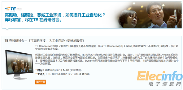 [中國–2015年8月12日]e絡盟日前宣布將攜手全球連接器產(chǎn)品領先供應商TE Connectivity(TE)舉辦在線研討會。研討會將集中探討適用于自動化、控制、工業(yè)機械和設備等應用的連接解決方案,其中包括機器人、工業(yè)流程控制及運動控制等。該研討會將于2015年8月27日正式召開。
