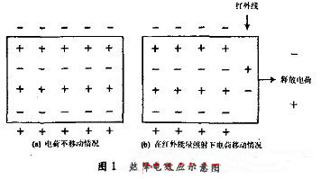 某些強(qiáng)介電物質(zhì)(PZT,LiTaO3等)的表面接受了紅外線的輻射能量,其表面產(chǎn)生溫度變化,隨著溫度的上升或下降,這些物質(zhì)表面上就會(huì)產(chǎn)生電荷的變化,這種現(xiàn)象稱為熱釋電效應(yīng)。圖1為晶體表面電荷隨溫度變化的移動(dòng)情況。