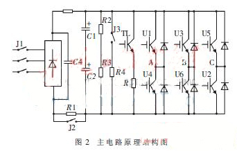 如圖2所示,TL、RL構(gòu)成泵升電壓吸收電路[5],當(dāng)電機(jī)負(fù)載進(jìn)入制動(dòng)狀態(tài)時(shí),反饋電流將向中間直流回路電容充電,導(dǎo)致直流電壓上升。當(dāng)直流電壓上升到一定值時(shí),控制TL導(dǎo)通,使這部分能量消耗在電阻RL上,確保變頻器可靠安全地工作。此外,由J1常閉觸點(diǎn)與R4 組成斷電能量釋放電路。當(dāng)系統(tǒng)發(fā)生故障或關(guān)機(jī)時(shí),繼電器J1斷電,通過其常開觸點(diǎn),將變頻器與電網(wǎng)斷開;而常閉觸點(diǎn)閉合,利用R4為中間回路大電容所儲(chǔ)存的能量提高釋放通道。