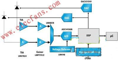 反補(bǔ)償運(yùn)算放大器最適合使用在電流-電壓轉(zhuǎn)換(跨阻)電路。在醫(yī)療儀器中,其中一個(gè)最普遍的應(yīng)用是測量血細(xì)胞中的含氧量,稱為SPO2或飽和或外圍氧氣。圖1所示為SPO2模塊的框圖,當(dāng)中的反補(bǔ)償放大器(TIA)用來將來自光二極管的電流轉(zhuǎn)化成電壓。