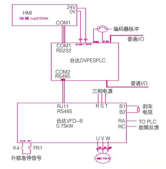 plc作為控制的核心,主要用來接收編碼器的反饋信號實現(xiàn)對當(dāng)前位置的檢測,通過和設(shè)定值的比較用通訊功能來控制變頻器的輸出頻率從而實現(xiàn)精確定位。同時通過hmi可以方便的設(shè)定plc的一些內(nèi)部寄存器值進行人機交互,并且變頻器的工作頻率可以在hmi上方便修改和直觀顯示。臺達的dvp系列plc都具有兩個通訊口,com1是 rs232,com2是rs485,支持modbus ascii/rtu通訊格式,通訊速率最高可達115200bps,兩通訊口可以同時使用。所以無需用任何擴展模塊就可以實現(xiàn)既可連接用于參數(shù)設(shè)置的人機界面又可用通訊的方式控制變頻器等其它設(shè)備。并且dvp系列plc提供了針對modbus ascii/rtu模式的專用通訊指令,這樣在編寫通訊程序時就可以大大簡化,無需像用串行數(shù)據(jù)傳送指令rs那樣要進行復(fù)雜的校驗碼計算和遵循復(fù)雜的指令格式。臺達的vfd系列變頻器內(nèi)建有單獨的rs-485串聯(lián)通訊界面,并且也遵循modbus ascii/rtu通訊格式(vfd-a系列除外)。基與這些特點選用了性價比優(yōu)異的dvp es plc和vfd-b變頻器。整個系統(tǒng)的結(jié)構(gòu)圖如圖1所示。