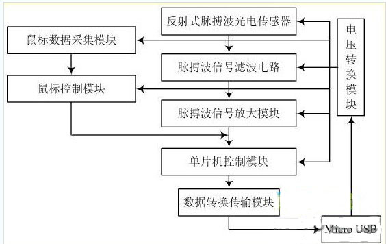 通過反射式脈搏波光電傳感器采集到包含人體多種生理參數(shù)的信號,然后由脈搏波信號濾波電路與脈搏波信號放大模塊對信號進行濾波和放大,并和鼠標數(shù)據(jù)采集模塊采集的數(shù)據(jù)在鼠標數(shù)據(jù)與脈搏波數(shù)據(jù)采集處理共用的單片機控制模塊匯集,經(jīng)過進一步處理之后傳輸?shù)綌?shù)據(jù)轉(zhuǎn)換傳輸模塊形成適合傳輸?shù)诫娔X端的信號形式,再經(jīng)由Micro USB接口傳輸?shù)诫娔X端進行進一步的信號處理和顯示。