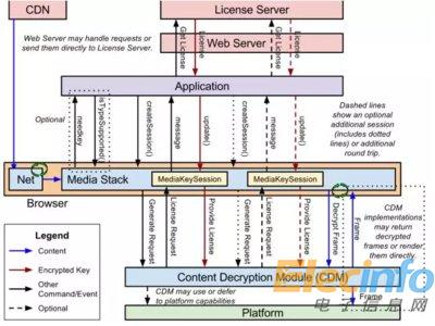 為了標(biāo)準(zhǔn)化 DRM 以及為各平臺的實現(xiàn)提供一定的互通性,幾個 Web 巨頭一起創(chuàng)建了通用加密標(biāo)準(zhǔn)Common Encryption (CENC)  和通用的多媒體加密擴(kuò)展Encrypted Media Extensions,以便為多個 DRM 提供商(例如,EME 可用于 Edge 平臺上的 Playready 和 Chrome 平臺上的 Widewine)構(gòu)建一套通用的 API,這些 API 能夠從 DRM 授權(quán)模塊讀取視頻內(nèi)容加密密鑰用于解密。