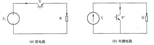 如圖1(a)是一個(gè)串聯(lián)晶體管原電路,如圖1(b)為它的對(duì)偶電路。其中開(kāi)關(guān)管V與V'對(duì)偶,電壓源與電流源對(duì)偶,電阻R與電導(dǎo)G對(duì)偶。電路中各支路的正方向是給定的,稱為有向支路。由有向支路組成的有向圖,可以畫(huà)出任一電路的有向主電路圖。在畫(huà)對(duì)偶有向圖時(shí),對(duì)偶有向支路必須與原有向圖中相應(yīng)支路成90°,并了解對(duì)偶圖的正方向規(guī)則。