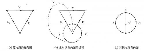 如圖3(a)是二極管整流電路,如圖3(b)為其對(duì)偶電路。如圖4說(shuō)明與如圖3(a)對(duì)偶電路有向圖的構(gòu)成過(guò)程。如圖4(a)為原電路的有向圖,如圖4(b)為求對(duì)偶有向圖的過(guò)程,比較如圖4(b)和如圖2(b),可見(jiàn)用規(guī)則1、規(guī)則2可以決定含G和含電流源I,的有向支路方向。在決定對(duì)偶二極管D'的極性時(shí),注意到如圖3(a)整流電路中,二極管D處于正向?qū)顟B(tài),則對(duì)偶二極管D'應(yīng)處于反向關(guān)斷狀態(tài),如圖3(b)所示。
