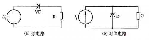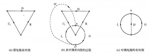 規(guī)則4:含二極管D的有向支路順時(shí)針?lè)较蜣D(zhuǎn)90°,即得含對(duì)偶二極管D'的有向支路,從而可以確定對(duì)偶二極管的極性。