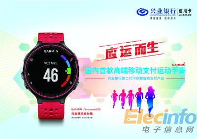 作為興業(yè)銀行“第二代可穿戴智能支付產(chǎn)品”,這款運動手表在 Garmin Forerunner235 系列產(chǎn)品基礎(chǔ)上,加載了金融支付功能,只要將手表屏幕貼近具有銀聯(lián)閃付標(biāo)識的機具(如POS機、自動售貨機、ATM等)感應(yīng)區(qū)即可完成支付交易。并且該款腕表采用了 Garmin 自主研發(fā)的全球領(lǐng)先的光學(xué)心率技術(shù),在讀取佩戴者行進速度與穩(wěn)定性方面更勝一籌,還加載了智能通知應(yīng)用,方便佩戴者在運動過程接收來電、短信提醒以及微博、微信等手機信息。