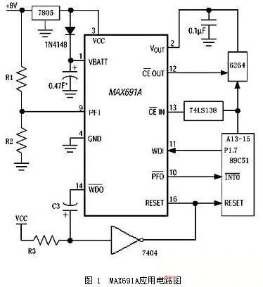 另外,MAX691A還具有振蕩頻率選擇(7、8引腳)等功能,可以調(diào)節(jié)復(fù)位和看門狗定時(shí)器的時(shí)間。在圖1中,增加了微分電路和反相器,使WDO(——————)直接引發(fā)系統(tǒng)復(fù)位,大大簡(jiǎn)化了軟件的抗干擾設(shè)計(jì)。