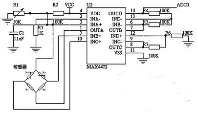 如下圖所示,本電路采用BP01型壓力傳感器和運(yùn)放MAX4472。BP01型壓力傳感器是為檢測(cè)血壓而專門設(shè)計(jì)的,主要用于便攜式電子血壓計(jì)。它采用精密厚膜陶瓷芯片和尼龍塑料封裝,具有高線性、低噪聲和外界應(yīng)力小的特點(diǎn);采用內(nèi)部標(biāo)定和溫度補(bǔ)償方式,提高了測(cè)量精度、穩(wěn)定性和重復(fù)性,在全量程范圍內(nèi),精度為±1%、零點(diǎn)失調(diào)不大于±300μV。MAX4472是MAXIM公司的一款集成了四個(gè)運(yùn)算放大器的低功耗放大芯片。本系統(tǒng)中內(nèi)部集成運(yùn)放A接恒流源,為壓力傳感器提供恒定的電流,運(yùn)放B和運(yùn)放C,運(yùn)放D組成差分輸入、單端輸出放大電路,直接輸入ADC0監(jiān)視血壓直流分量。