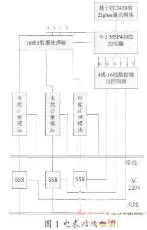 采用此種計(jì)量方式不僅可以保證測(cè)量精度,而且大大節(jié)省了控制器芯片的端口資源從而有效降低系統(tǒng)成本。數(shù)據(jù)選擇器采用控制器對(duì)其4個(gè)控制引腳的不同職位實(shí)現(xiàn)16個(gè)數(shù)據(jù)上傳通道的逐次接通。電表的執(zhí)行單元由一個(gè)4線(xiàn)—16線(xiàn)數(shù)據(jù)輸出控制器和16個(gè)SSR構(gòu)成,一旦單片機(jī)收到上端集中器下傳來(lái)的欠費(fèi)或者其他原因引起的斷電信號(hào)就立即通過(guò)對(duì)4線(xiàn)—16線(xiàn)數(shù)據(jù)輸出控制器的G0,G1,A,B,C,D 6個(gè)引腳的不同置位控制相應(yīng)用戶(hù)所屬的固態(tài)繼電器切斷其電源供應(yīng)。